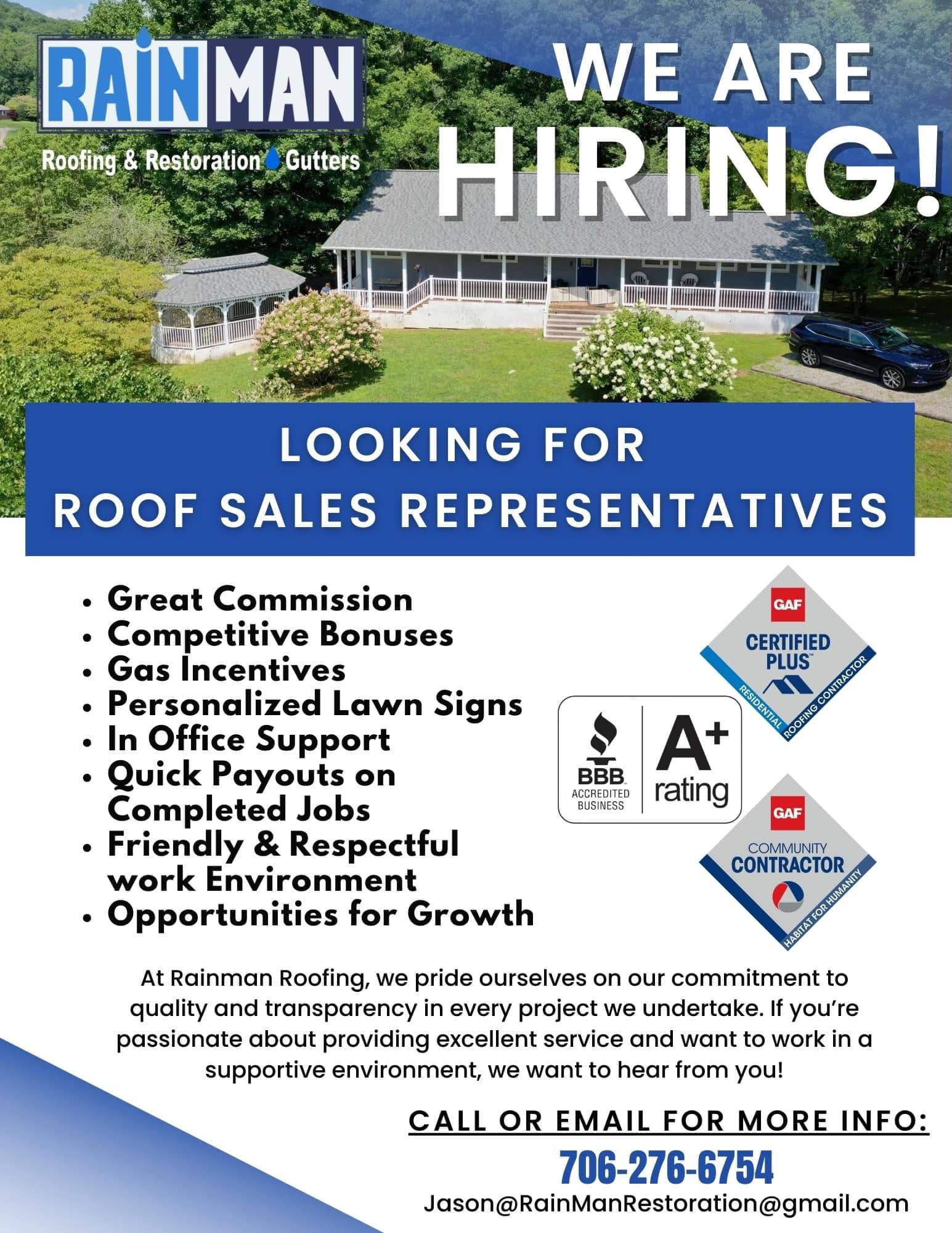 Are you a driven individual who thrives on results? Do you have a passion for sales and a desire to succeed? If so, we want YOU to join our team at RainMan Roofing and Restoration!